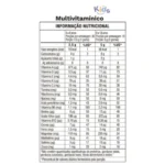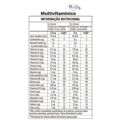 Ingredientes: Vitaminas e Minerais: Vitamina A, Vitamina B1 (Tiamina), Niacina (B3), Ácido Pantotênico (B5), Vitamina B6, Biotina (B7), Ácido Fólico (B9), Vitamina B12, Vitamina C, Vitamina D, Vitamina E, Vitamina K, Ferro, Zinco, Magnésio, Molibdênio, Cromo e Selênio. Composição da Goma: Tapioca orgânica, açúcar de cana natural, água, pectina (gelificante vegetal), ácido cítrico, citrato de sódio, aroma natural de framboesa e corante natural betacarotenos vegetais. Produto Vegano. Não contém glúten. Não contém lactose.