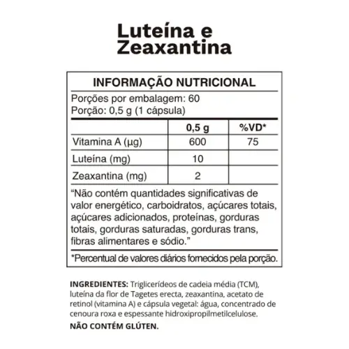 Ingredientes: Luteína da flor de Tagetes erecta, Zeaxantina da flor de Tagetes erecta, Vitamina A (Acetato de Retinol) e Triglicerídeos de Cadeia Média (TCM). Composição da cápsula: Cápsula vegetal. Produto Vegano. Não contém glúten.
