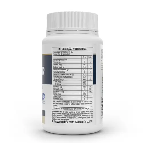 Ingredientes: Óleo de peixe, acetato de DL-alfa-tocoferol (vitamina E), L-cisteína, taurina, luteína da flor de Tagetes erecta, zeaxantina, acetato de retinol (vitamina A), cianocobalamina (vitamina B12), cápsula (gelatina, água purificada e umectante glicerina). Não contém glúten.